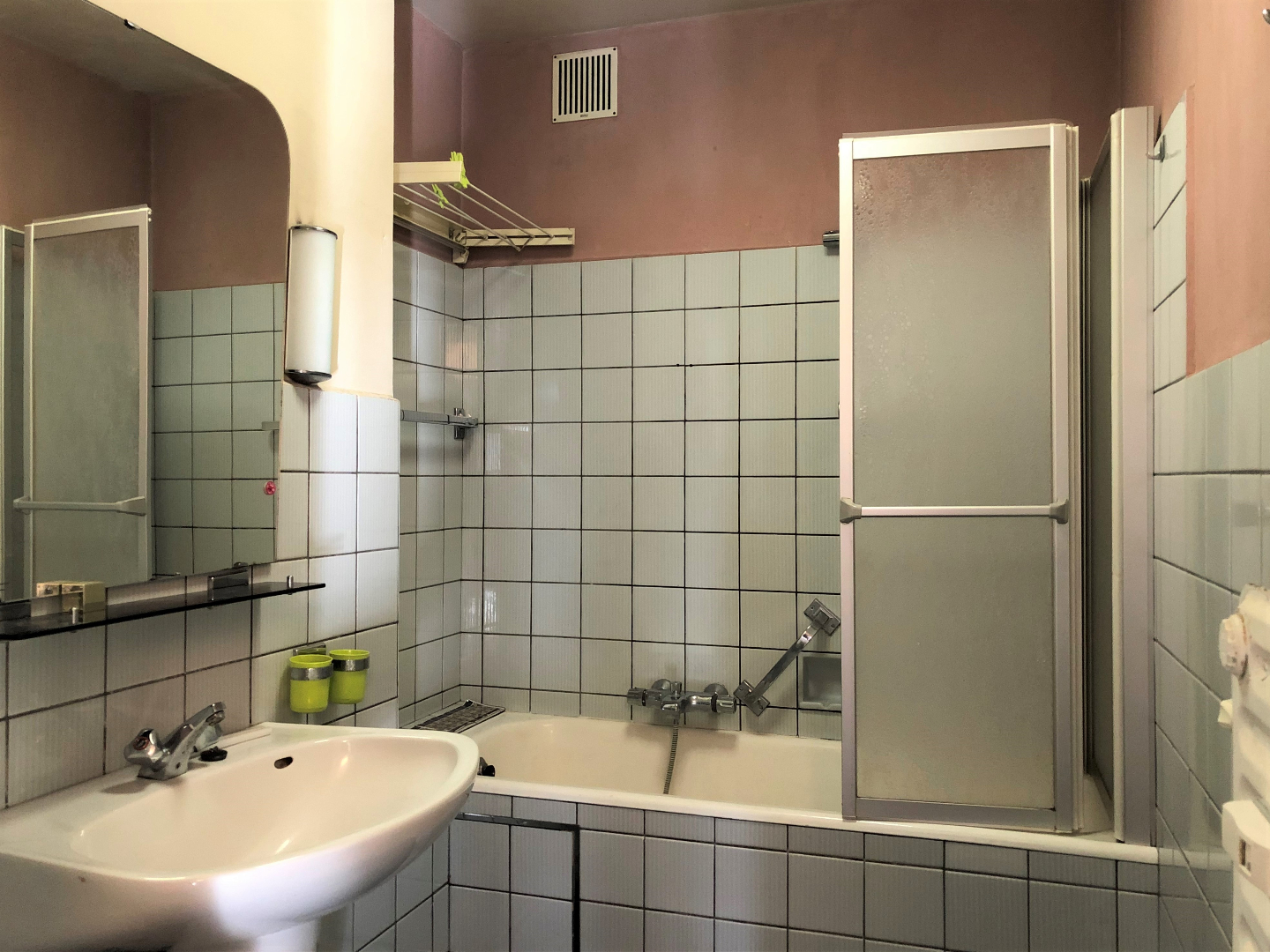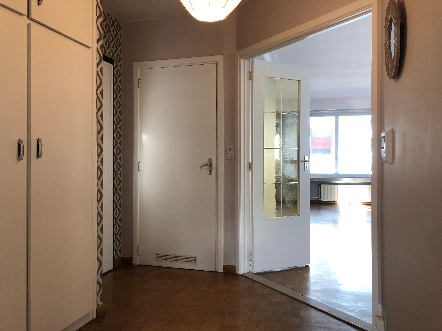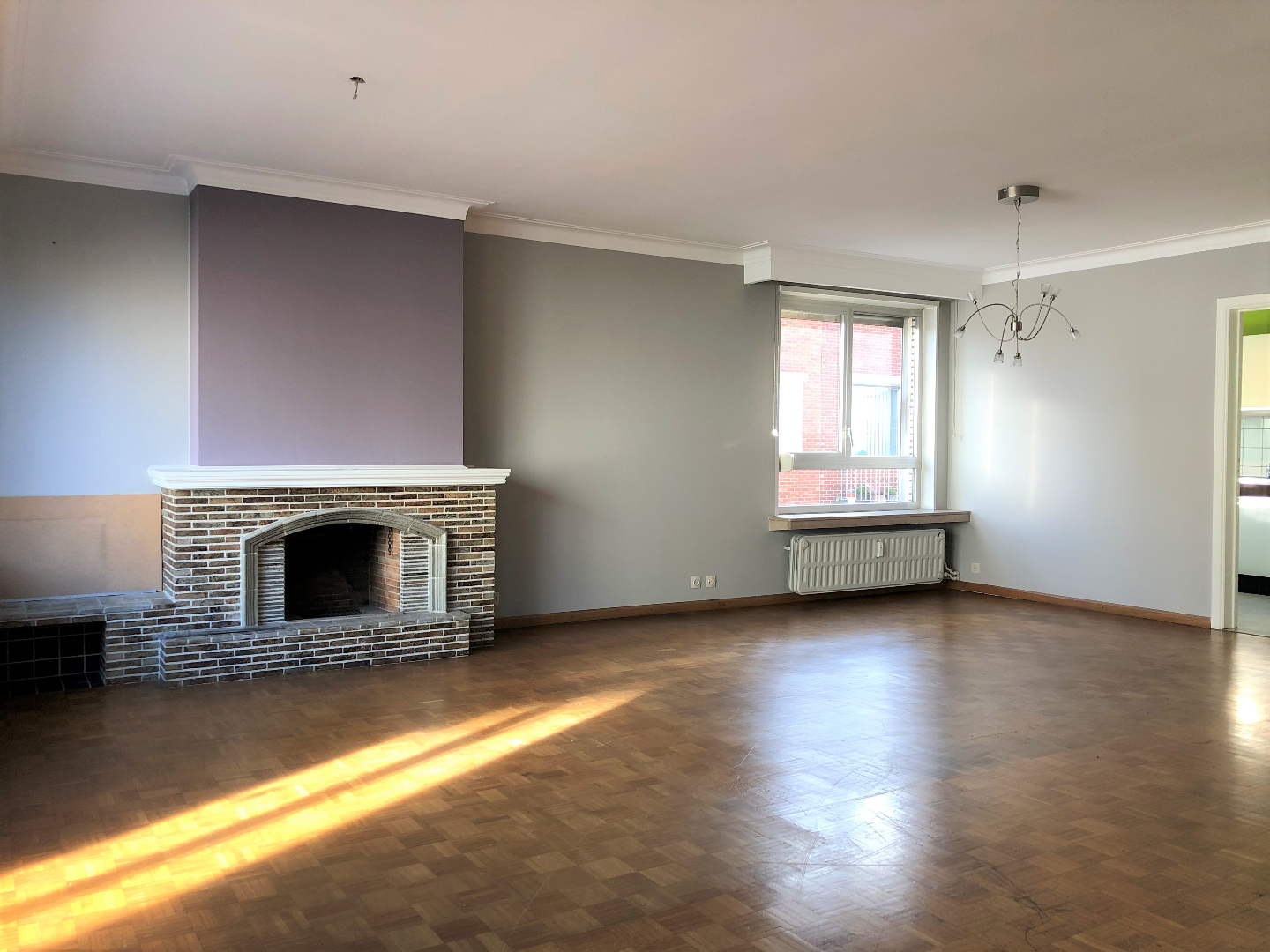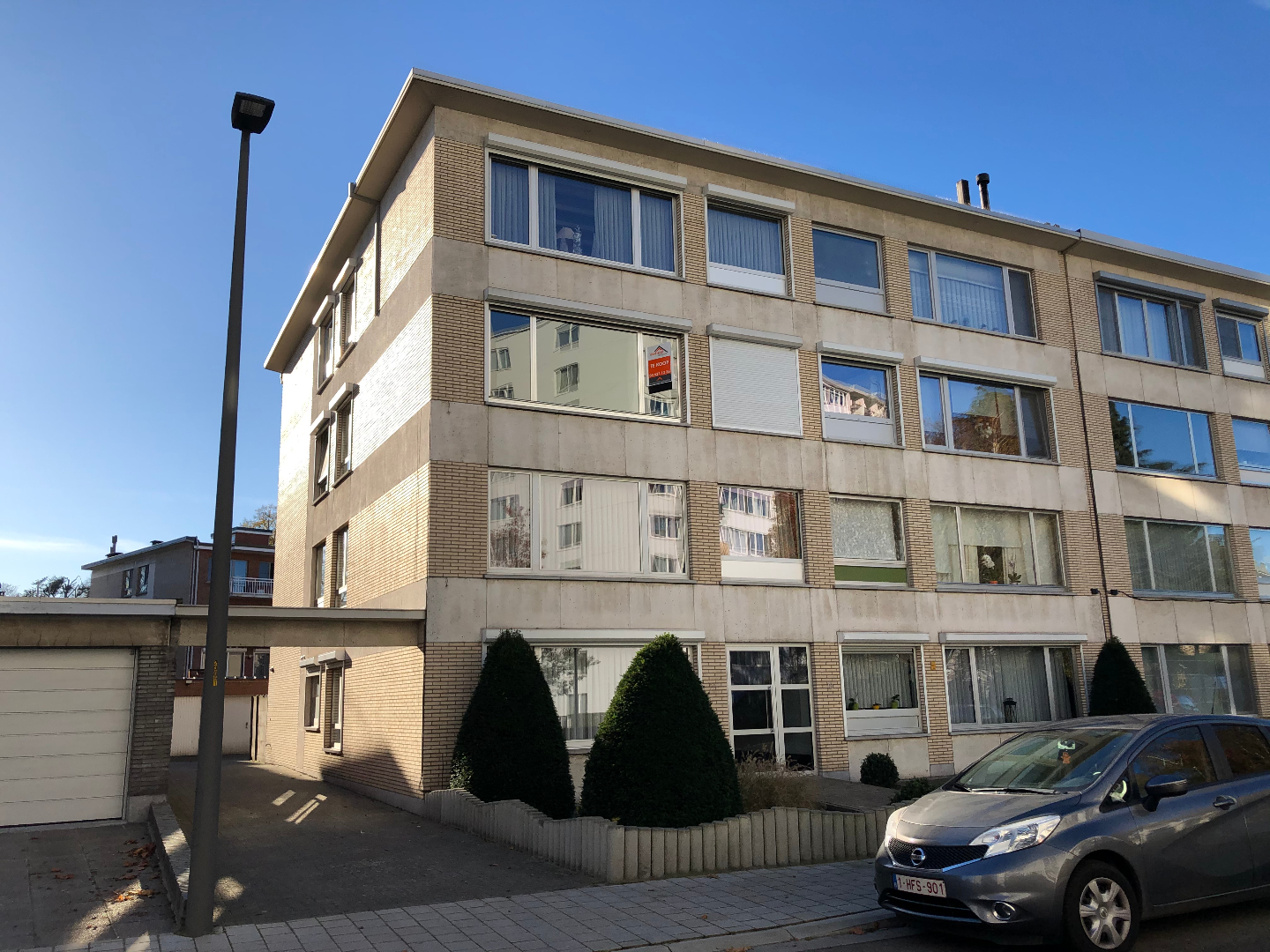 Dit centraal gelegen appartement is gelegen op de tweede verdieping van een kleinschalig gebouw met lift. Indeling: een inkomhal met vestiairekast, een zonovergoten woon-en eetkamer 35m² op blokparket, een keuken uitgerust met een elektrisch kookvuur en opbergkasten. Vanuit de inkomhal heeft u toegang tot een apart toilet en de badkamer die voorzien is van een ligbad, lavabo en aansluiting voor uw wasmachine. Er zijn twee slaapkamers (10m² en 17m²) waarvan de grootste uitgeeft op een terras met opbergkast. In de ondergrondse verdieping is er een privatieve kelderberging ter beschikking. Er is tevens een garagebox met kantelpoort aanwezig.