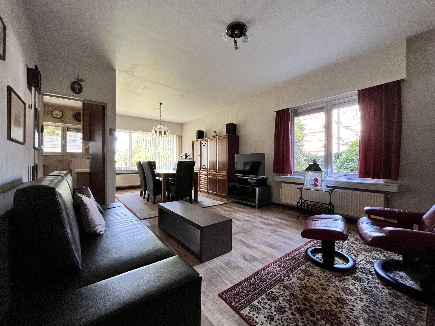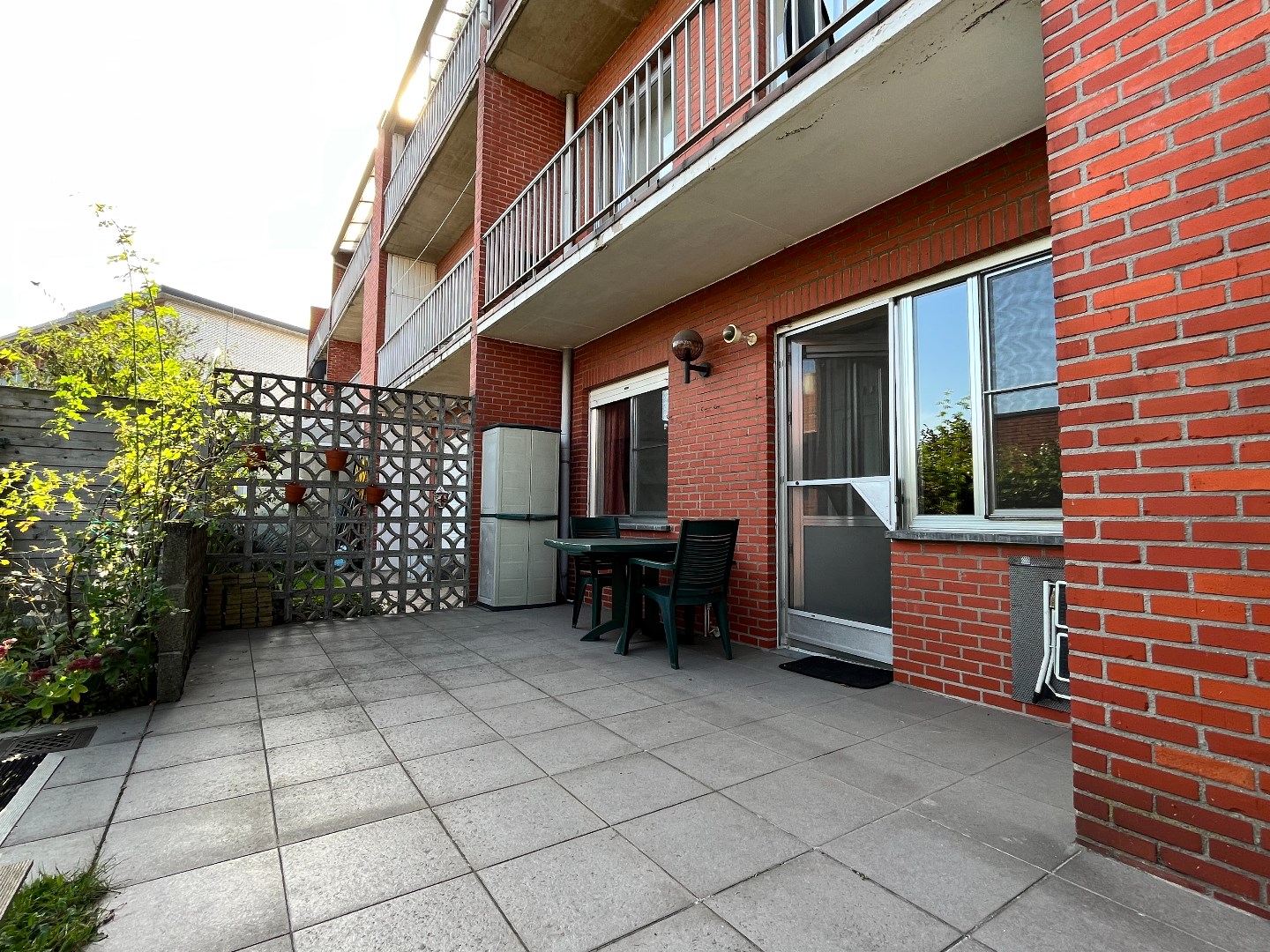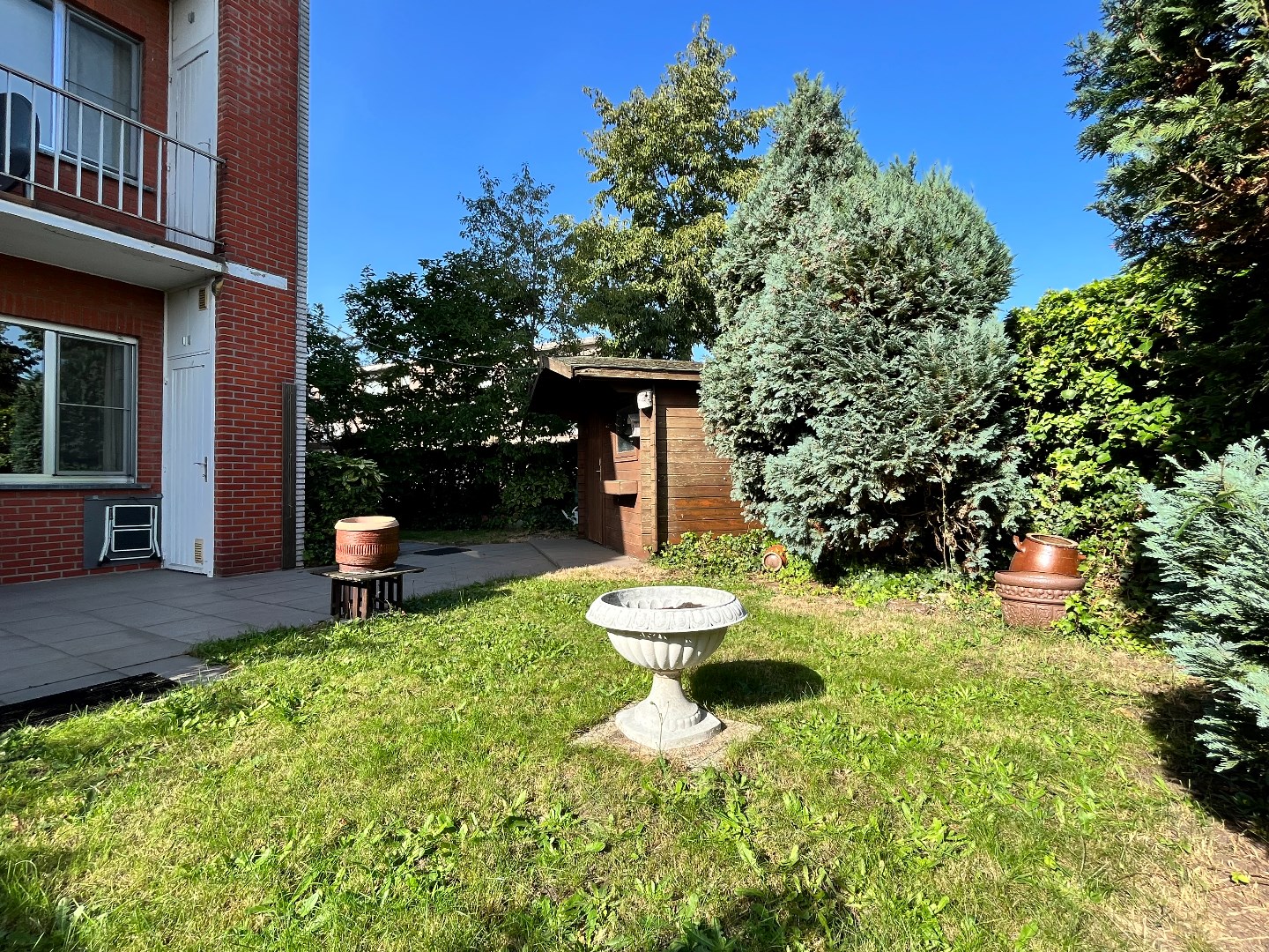 Het appartement bevindt zich op de gelijkvloerse verdieping en is voorzien van een privatieve tuin met tuinhuis en parkeergelegenheid. Indeling: inkom met gastentoilet en aparte berging, een woon- en eetkamer met aanpalend een keuken. Nachthal, een badkamer met ligbad/douchescherm en dubbele lavabo met meubel, 2 slaapkamers (14m² en 9m²) waarvan één kamer met toegang biedt tot het terras en tuin. Er is een aparte garagebox beschikbaar. Ideaal als investeringsobject of geschikt voor eigen bewoning. Gunstige locatie op een steenworp van het centrum, rustige woonwijk, nabij invalswegen naar autostrade en treinstation.