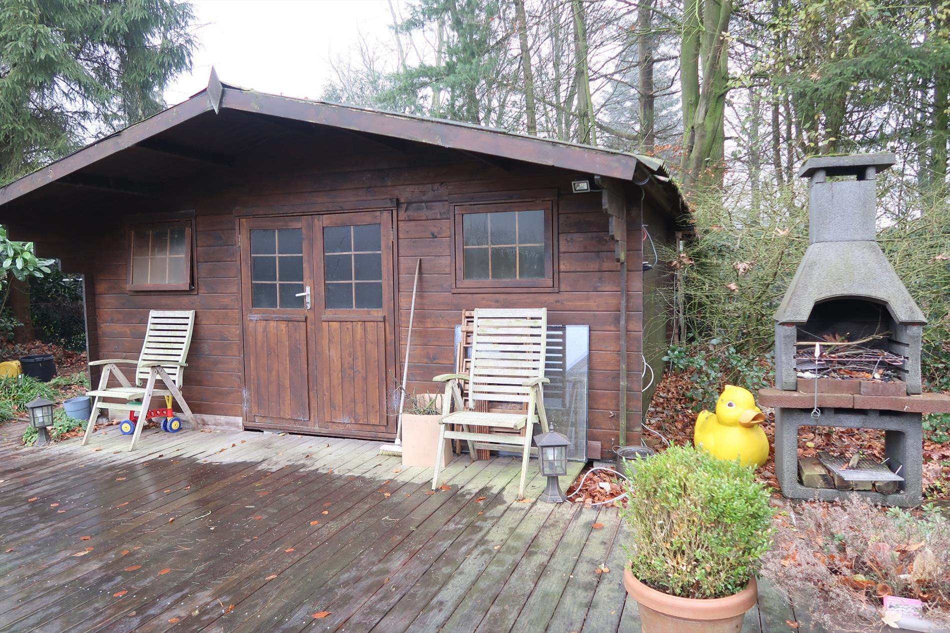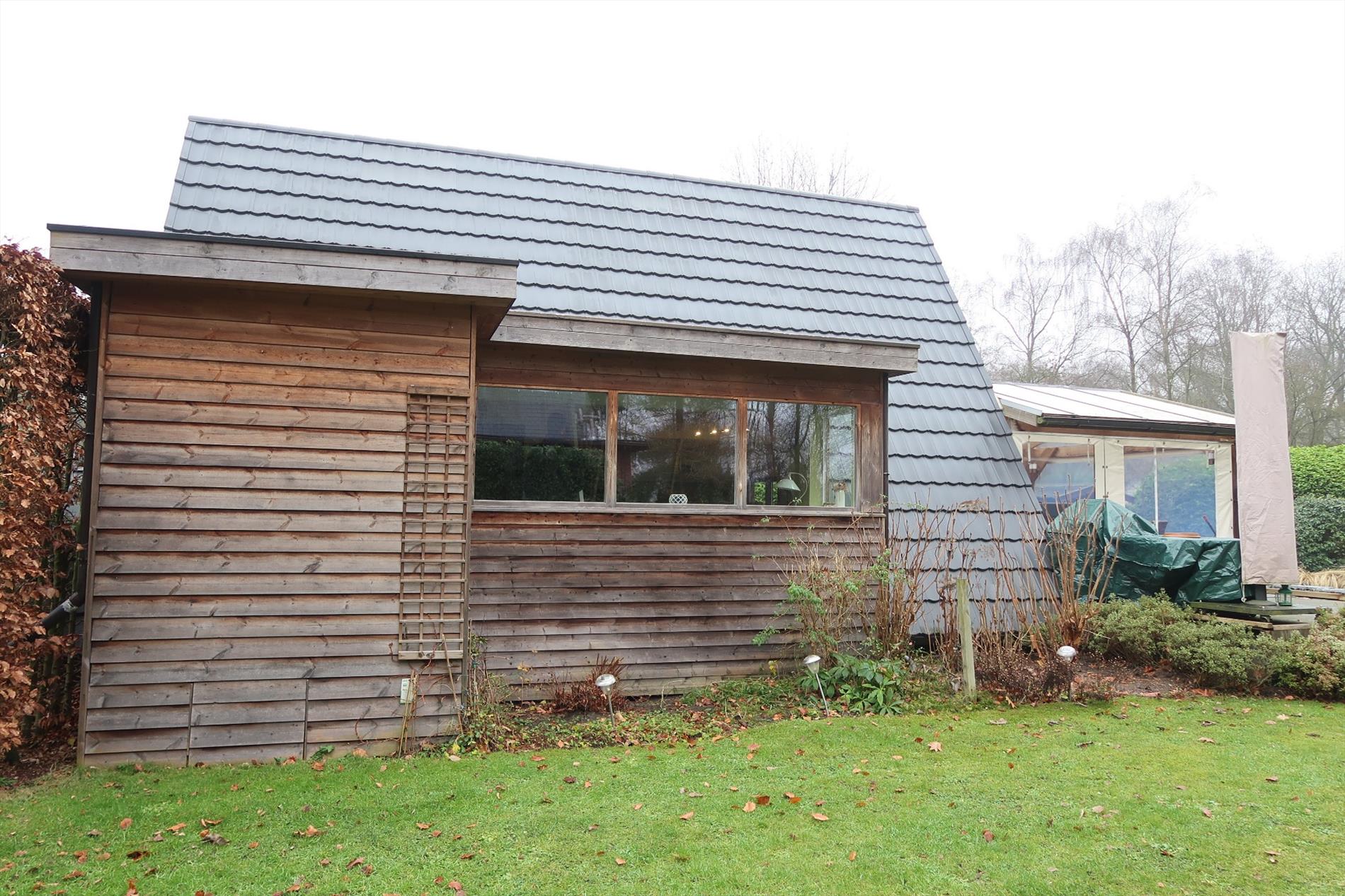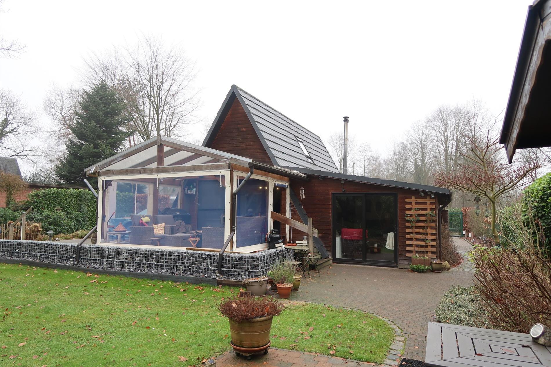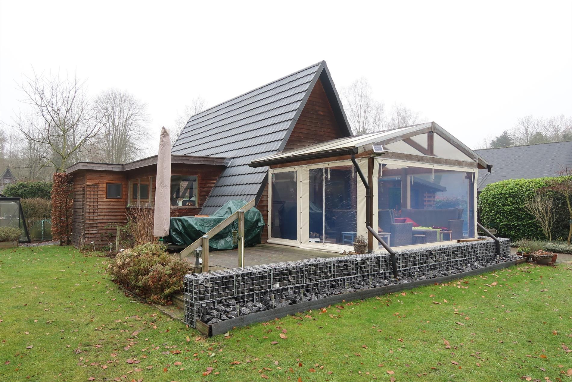 In een rustige woonomgeving werd deze woning opgetrokken op een perceel van 1000m² in BPA recreatief woongebied = permanent wonen. De woning is zeer verzorgd voorzien van hedendaags comfort en ingedeeld als volgt: Inkom rechtstreeks in de leefruimte met open houten trap naar de verdieping. Vanuit de leefruimte stap je in de gezellige patio die uitzicht geeft op een vijverpartij en de aangelegde tuin. Een vernieuwde keuken ingericht met kookplaat, oven, spoelbak, koelkast. Verder is er een hal met kastenwand, een aparte berging, een hoofdslaapkamer en een comfortabele badkamer met inloopdouche, een wandmeubel en apart toilet. Op de verdieping is er een 2e slaapkamer met mogelijkheid tot een 3e kamer. Rondom de woning is er een fraaie onderhoudsvriendelijke tuin met 2 tuinbergingen en een open terras 14m² en een overdekt lounge terras 16m². Bijzonderheden: Elektrische verwarming op warmtepomp (energiezuinig), dubbelwandige bungalow met isolatie en afgewerkt met Thermowood, aanwezigheid van een dubbel dak.
