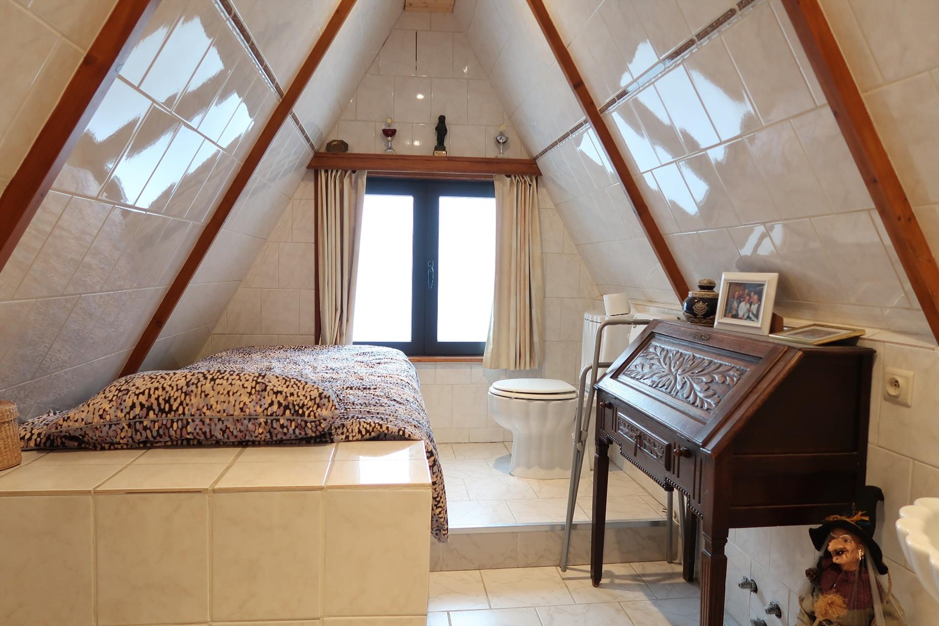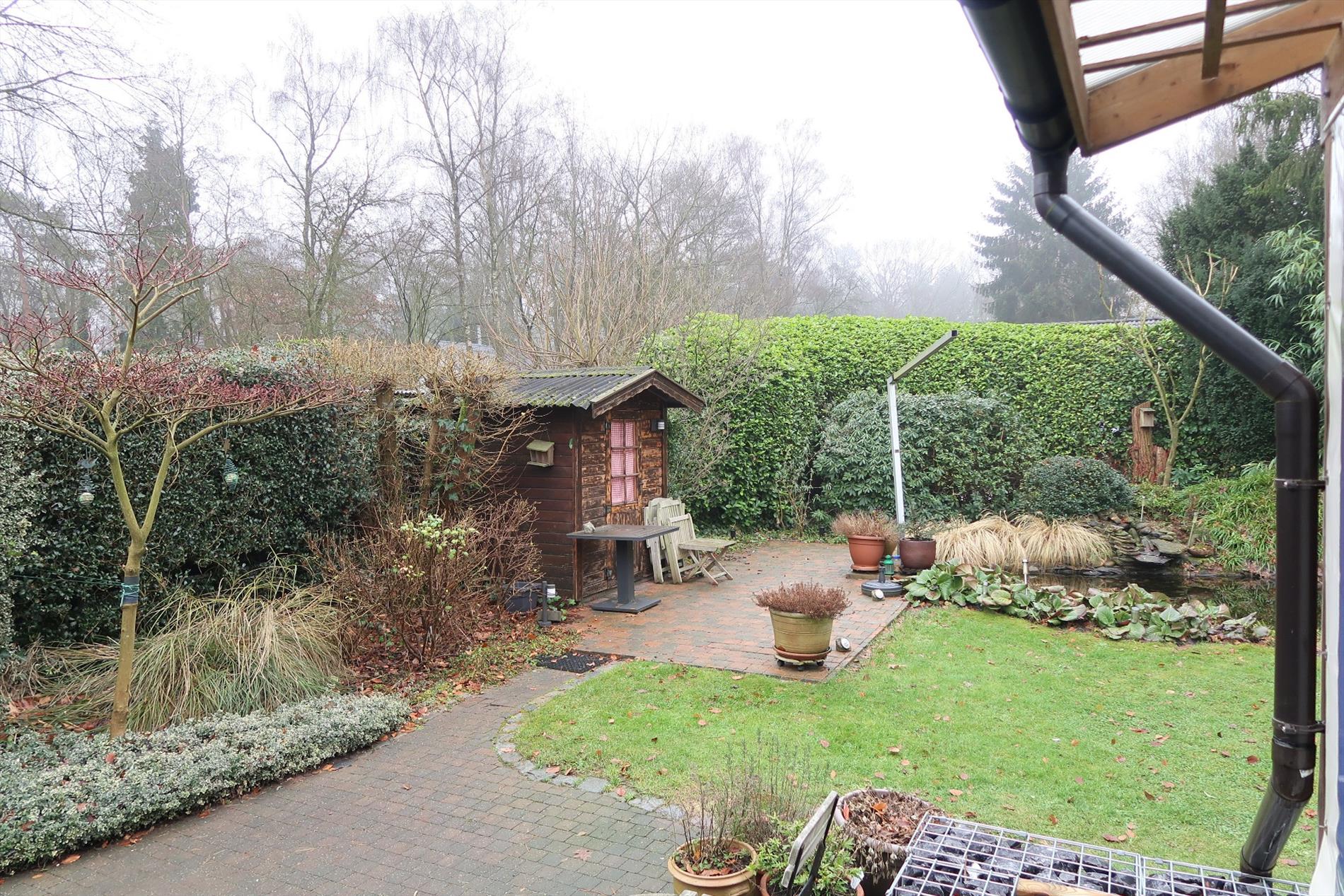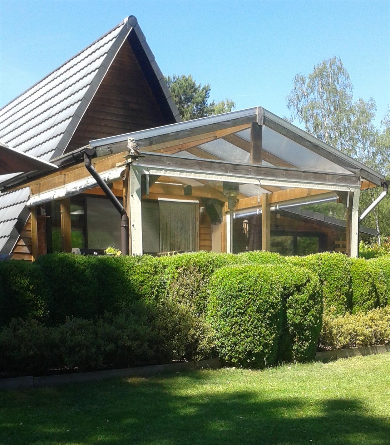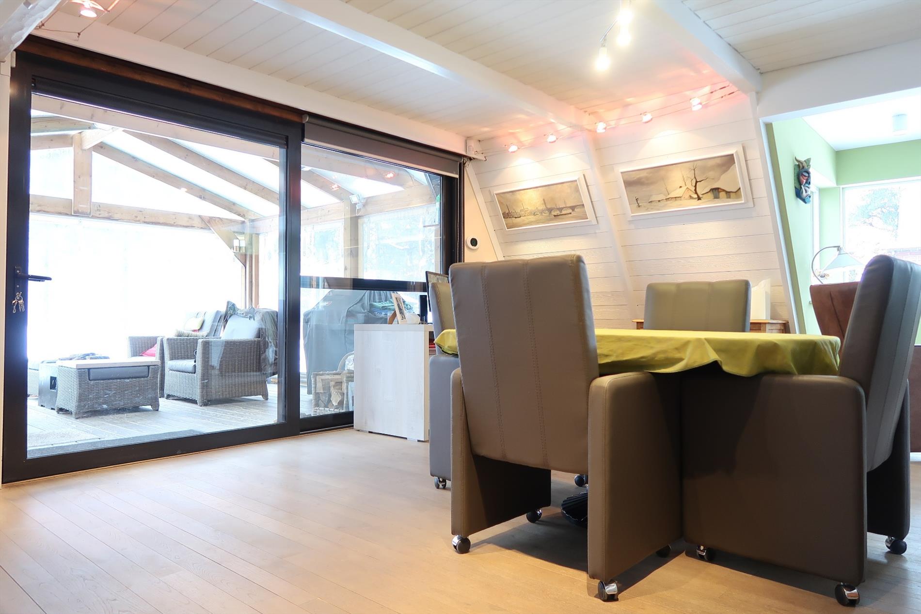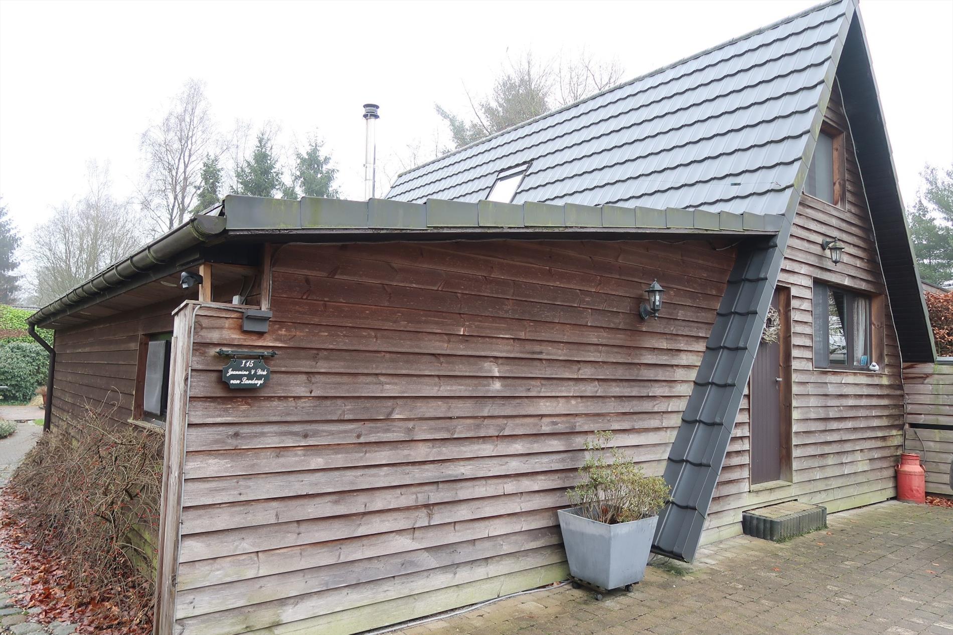 In een rustige woonomgeving werd deze woning opgetrokken op een perceel van 1000m² in BPA recreatief woongebied = permanent wonen. De woning is zeer verzorgd voorzien van hedendaags comfort en ingedeeld als volgt: Inkom rechtstreeks in de leefruimte met open houten trap naar de verdieping. Vanuit de leefruimte stap je in de gezellige patio die uitzicht geeft op een vijverpartij en de aangelegde tuin. Een vernieuwde keuken ingericht met kookplaat, oven, spoelbak, koelkast. Verder is er een hal met kastenwand, een aparte berging, een hoofdslaapkamer en een comfortabele badkamer met inloopdouche, een wandmeubel en apart toilet. Op de verdieping is er een 2e slaapkamer met mogelijkheid tot een 3e kamer. Rondom de woning is er een fraaie onderhoudsvriendelijke tuin met 2 tuinbergingen en een open terras 14m² en een overdekt lounge terras 16m². Bijzonderheden: Elektrische verwarming op warmtepomp (energiezuinig), dubbelwandige bungalow met isolatie en afgewerkt met Thermowood, aanwezigheid van een dubbel dak.