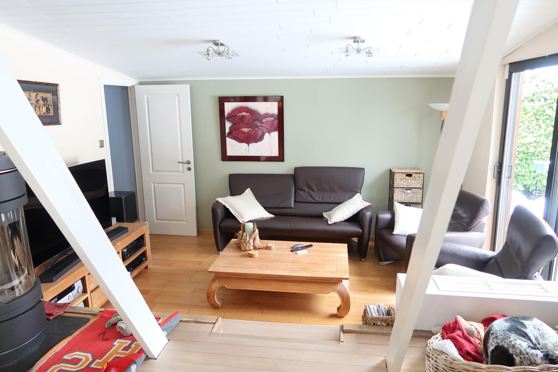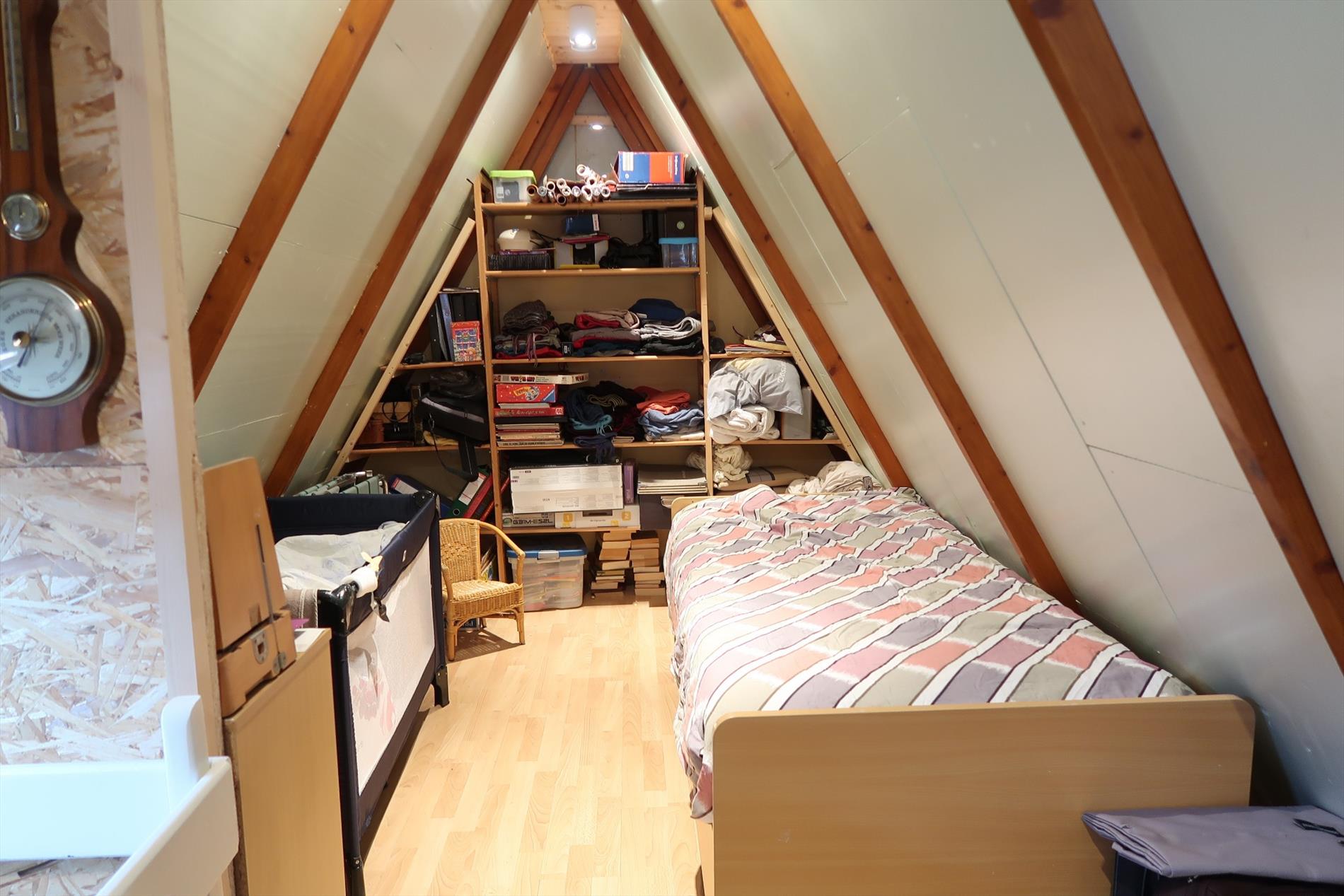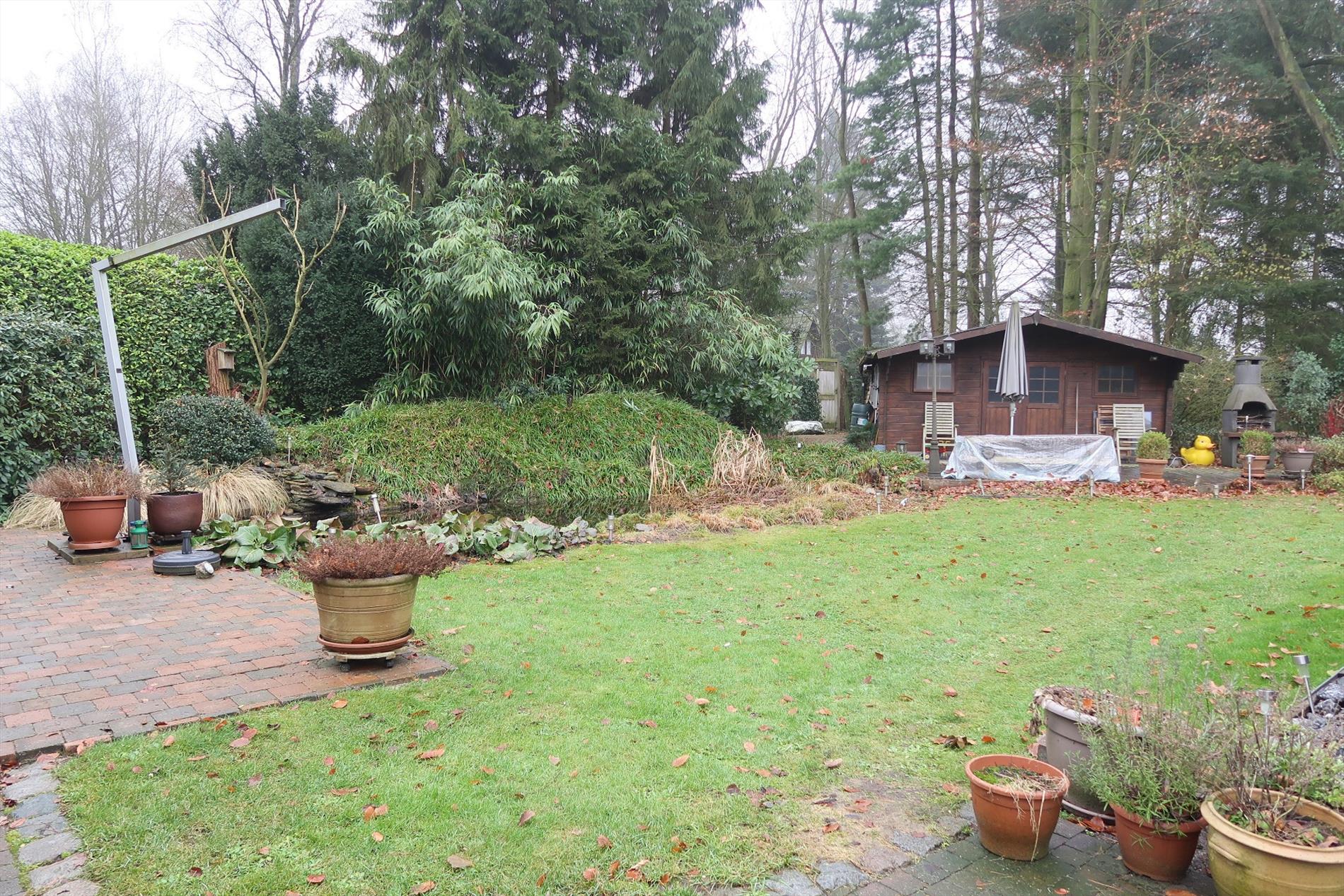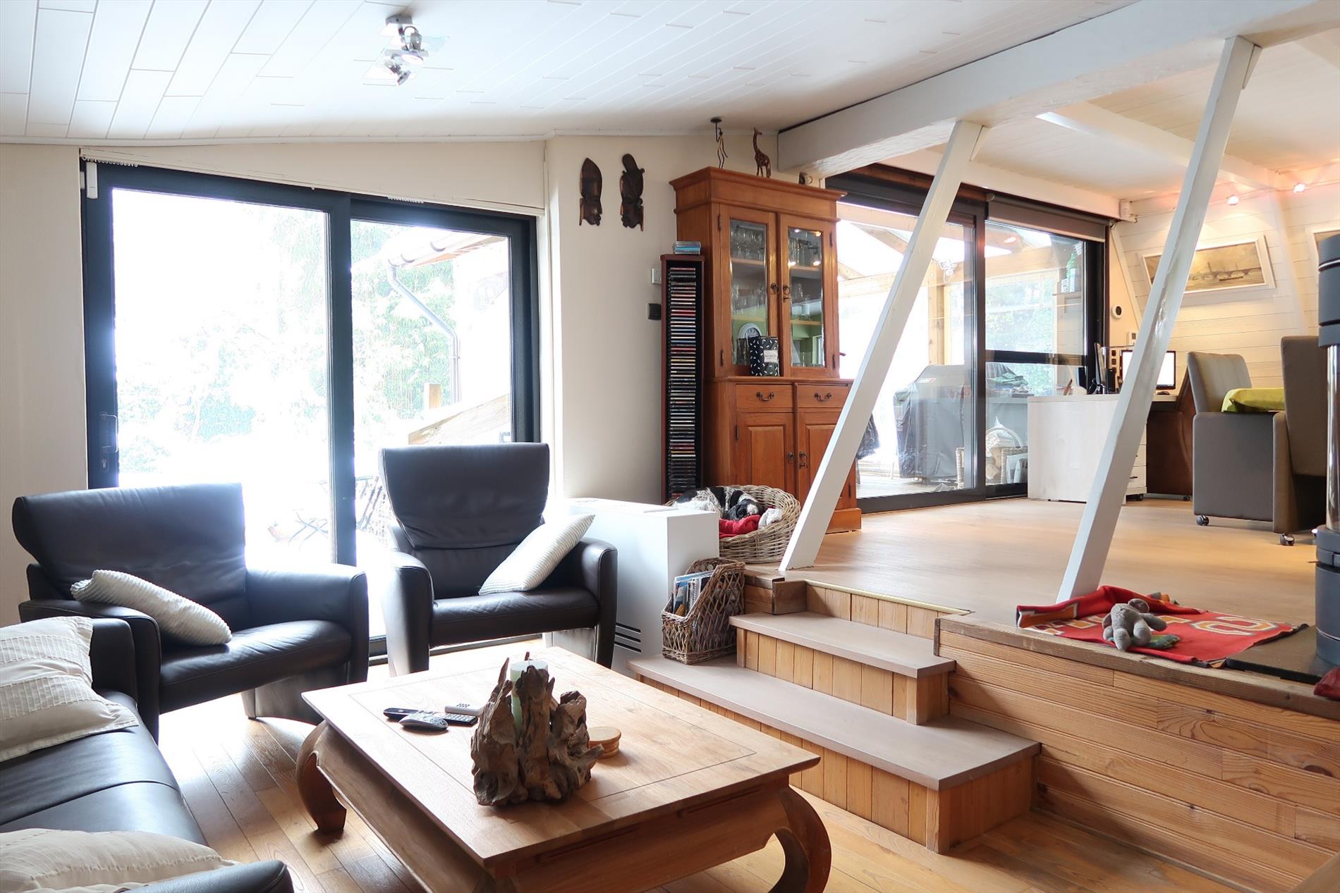 In een rustige woonomgeving werd deze woning opgetrokken op een perceel van 1000m² in BPA recreatief woongebied = permanent wonen. De woning is zeer verzorgd voorzien van hedendaags comfort en ingedeeld als volgt: Inkom rechtstreeks in de leefruimte met open houten trap naar de verdieping. Vanuit de leefruimte stap je in de gezellige patio die uitzicht geeft op een vijverpartij en de aangelegde tuin. Een vernieuwde keuken ingericht met kookplaat, oven, spoelbak, koelkast. Verder is er een hal met kastenwand, een aparte berging, een hoofdslaapkamer en een comfortabele badkamer met inloopdouche, een wandmeubel en apart toilet. Op de verdieping is er een 2e slaapkamer met mogelijkheid tot een 3e kamer. Rondom de woning is er een fraaie onderhoudsvriendelijke tuin met 2 tuinbergingen en een open terras 14m² en een overdekt lounge terras 16m². Bijzonderheden: Elektrische verwarming op warmtepomp (energiezuinig), dubbelwandige bungalow met isolatie en afgewerkt met Thermowood, aanwezigheid van een dubbel dak.