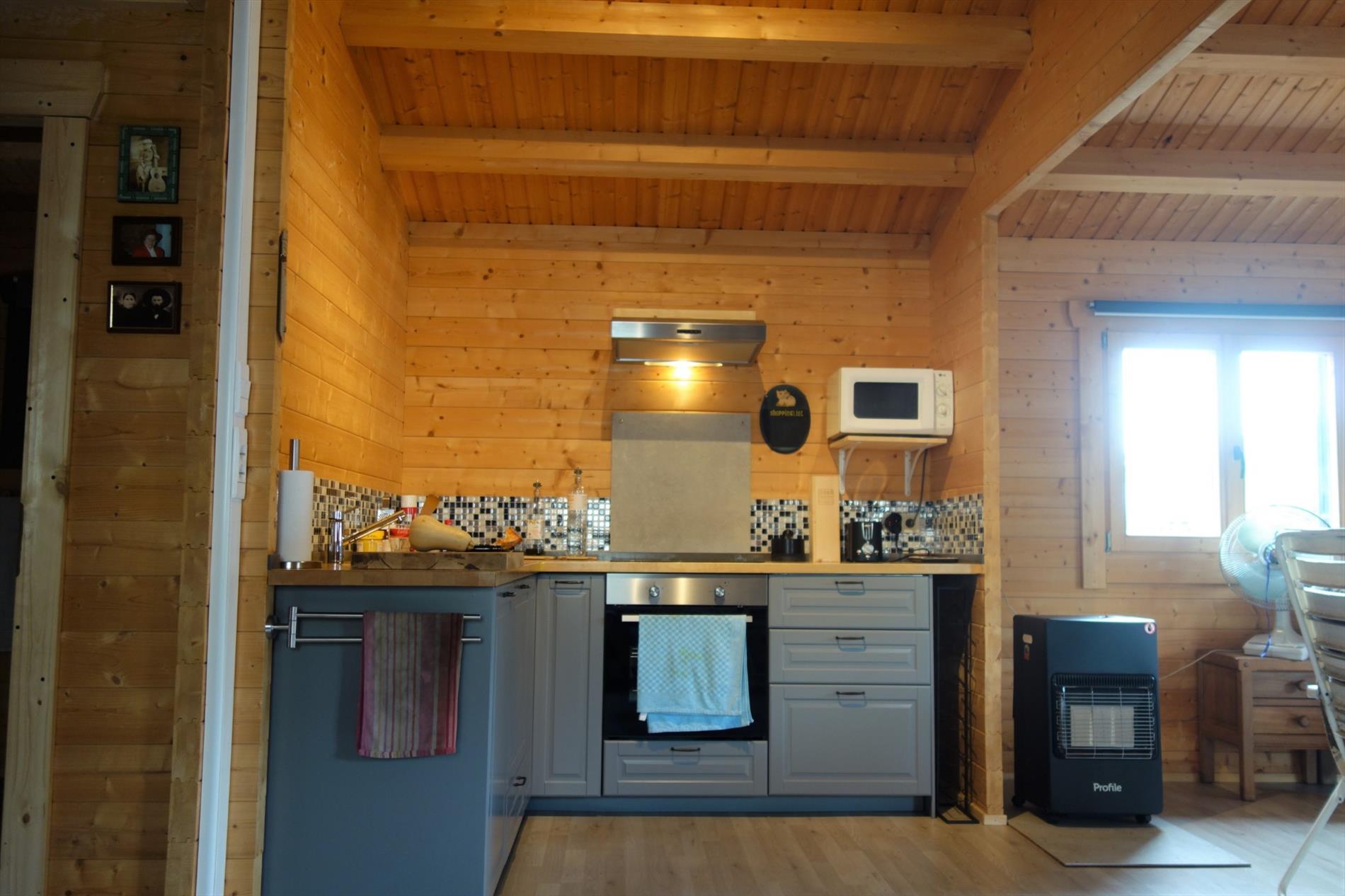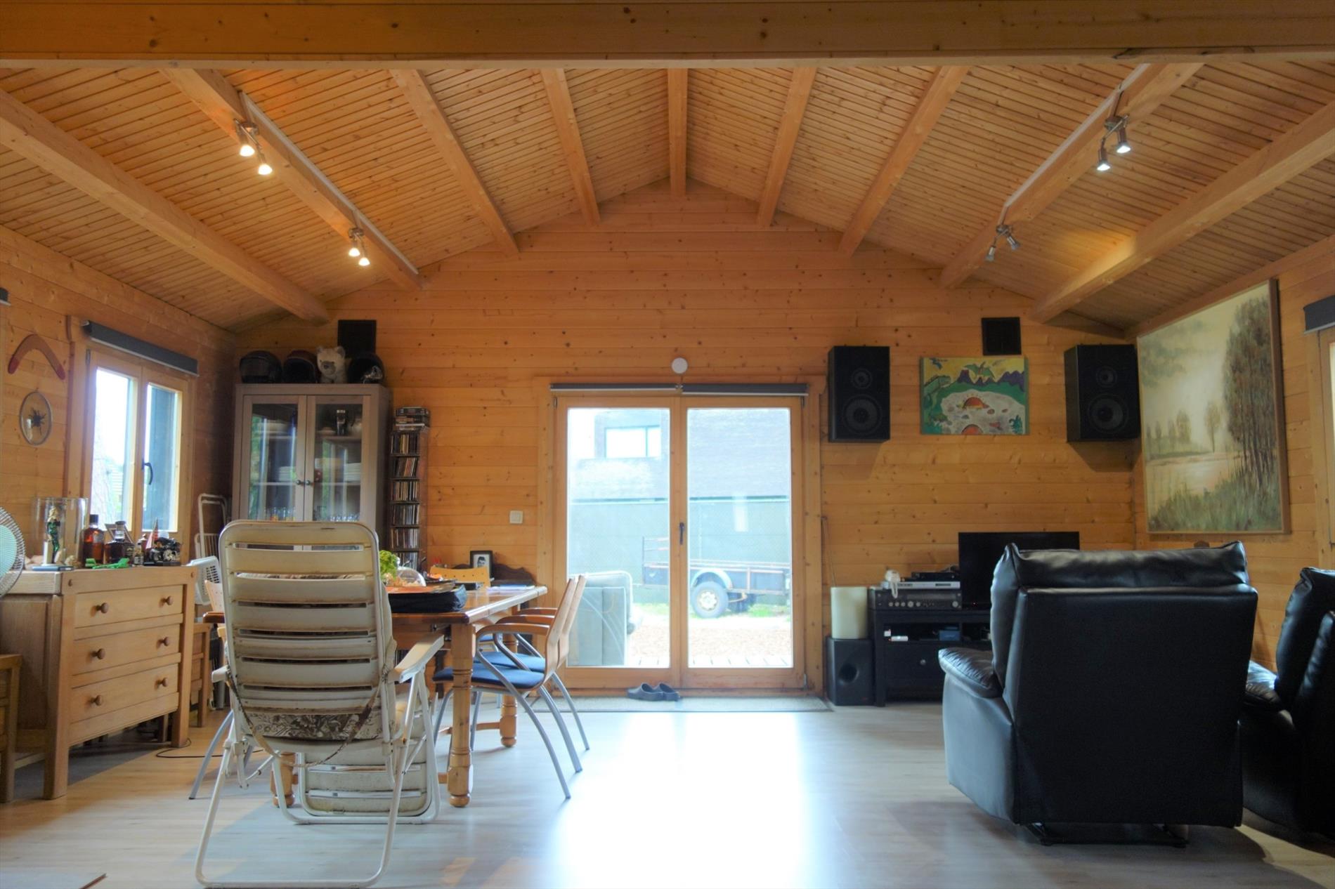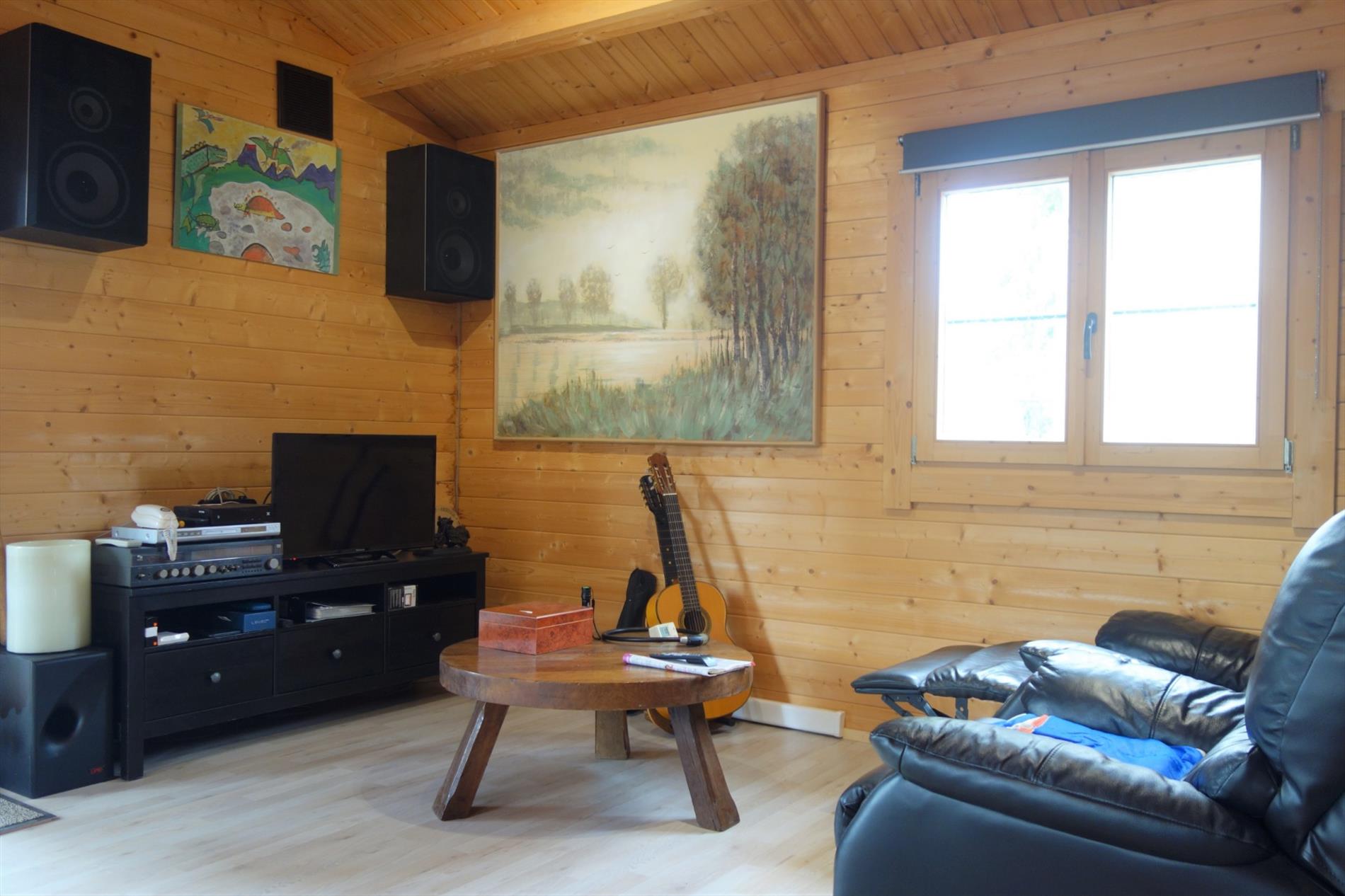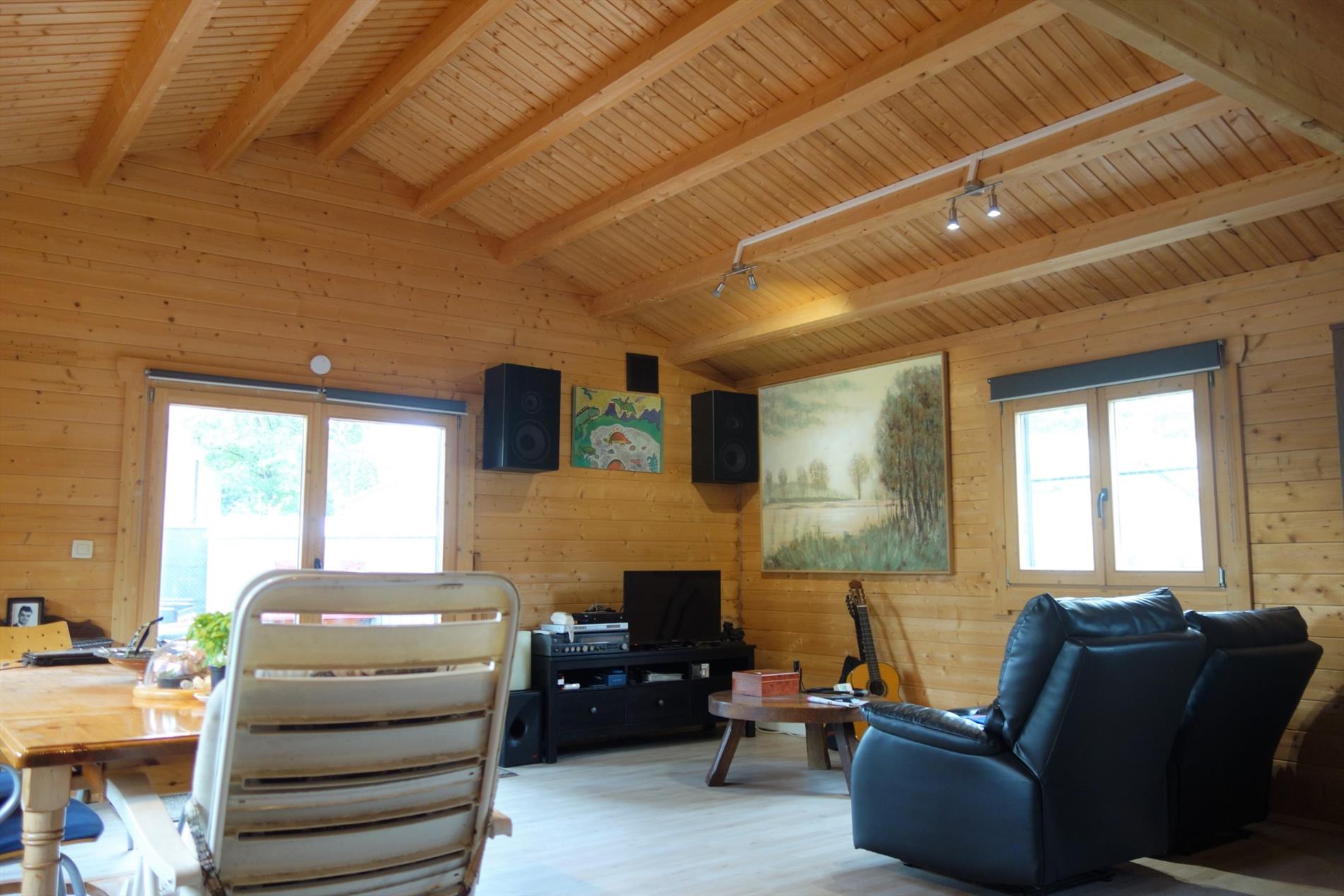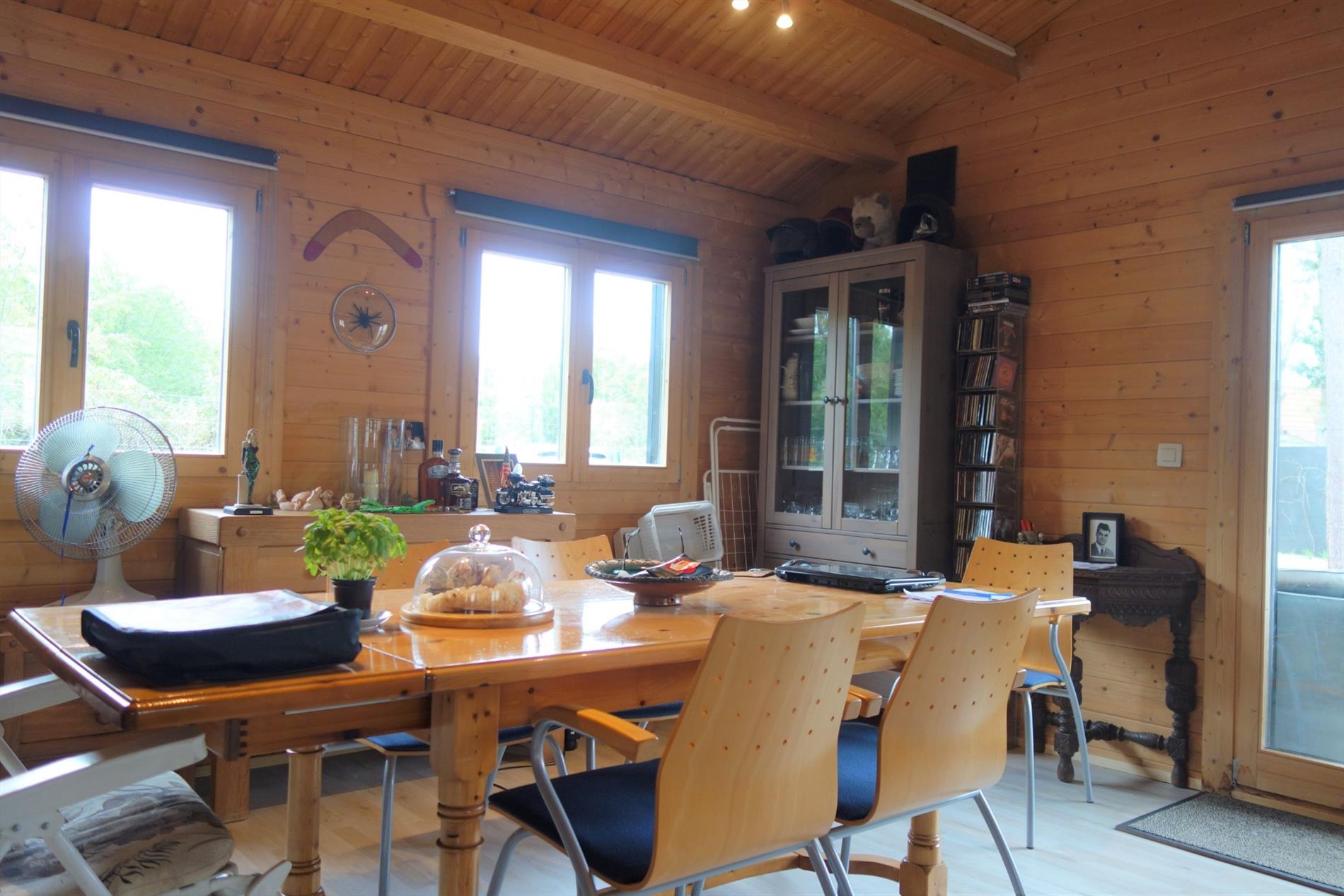 Deze chalet is zeer verzorgd voorzien van hedendaags comfort en ingedeeld als volgt: Inkom rechtstreeks in de leefruimte 30m² en haardpartij. Een open keuken voorzien van toestellen en veel bergruimte. Er zijn 2 slaapkamers (12m² en 10m²), een badkamer uitgerust met een douche, lavabo en toilet. Tevens is er een bergruimte met aansluiting tot wasmachine en droogkast. Bijzonderheden: In een rustige woonomgeving, doodlopende straat, werd deze woning opgetrokken op een perceel van 521m² in BPA recreatief woongebied = permanent wonen.