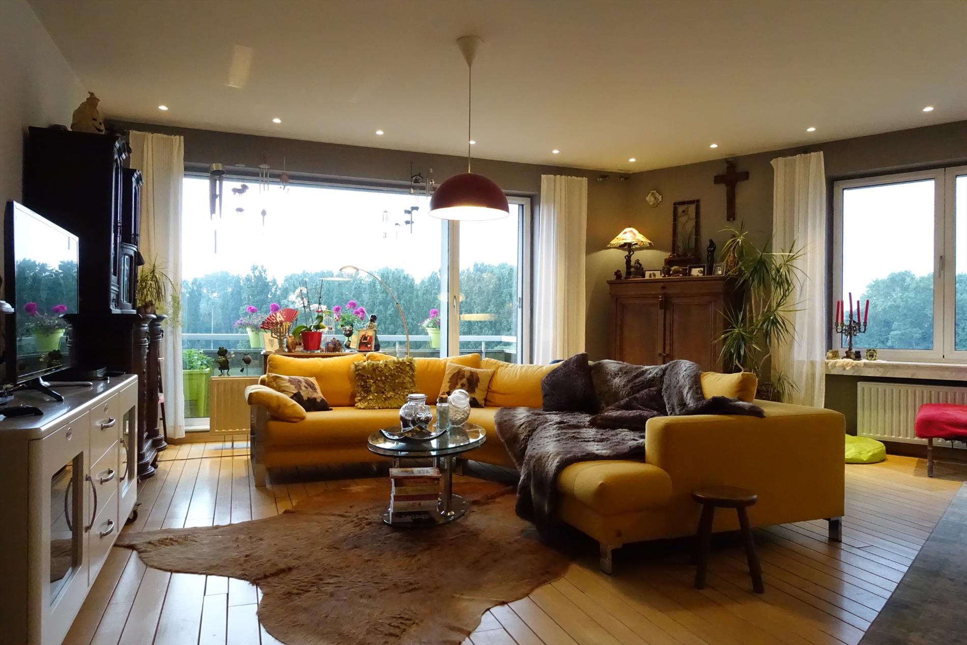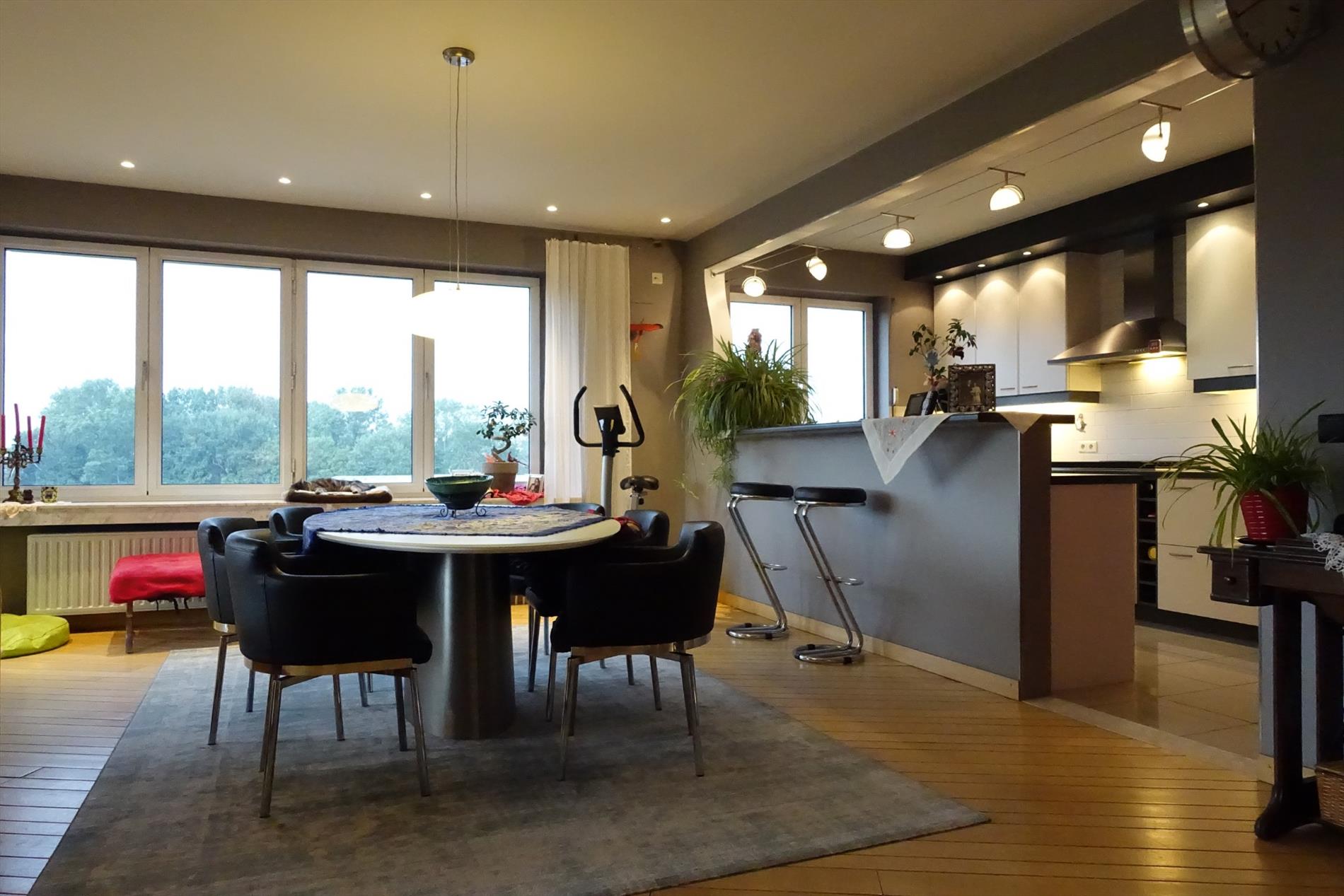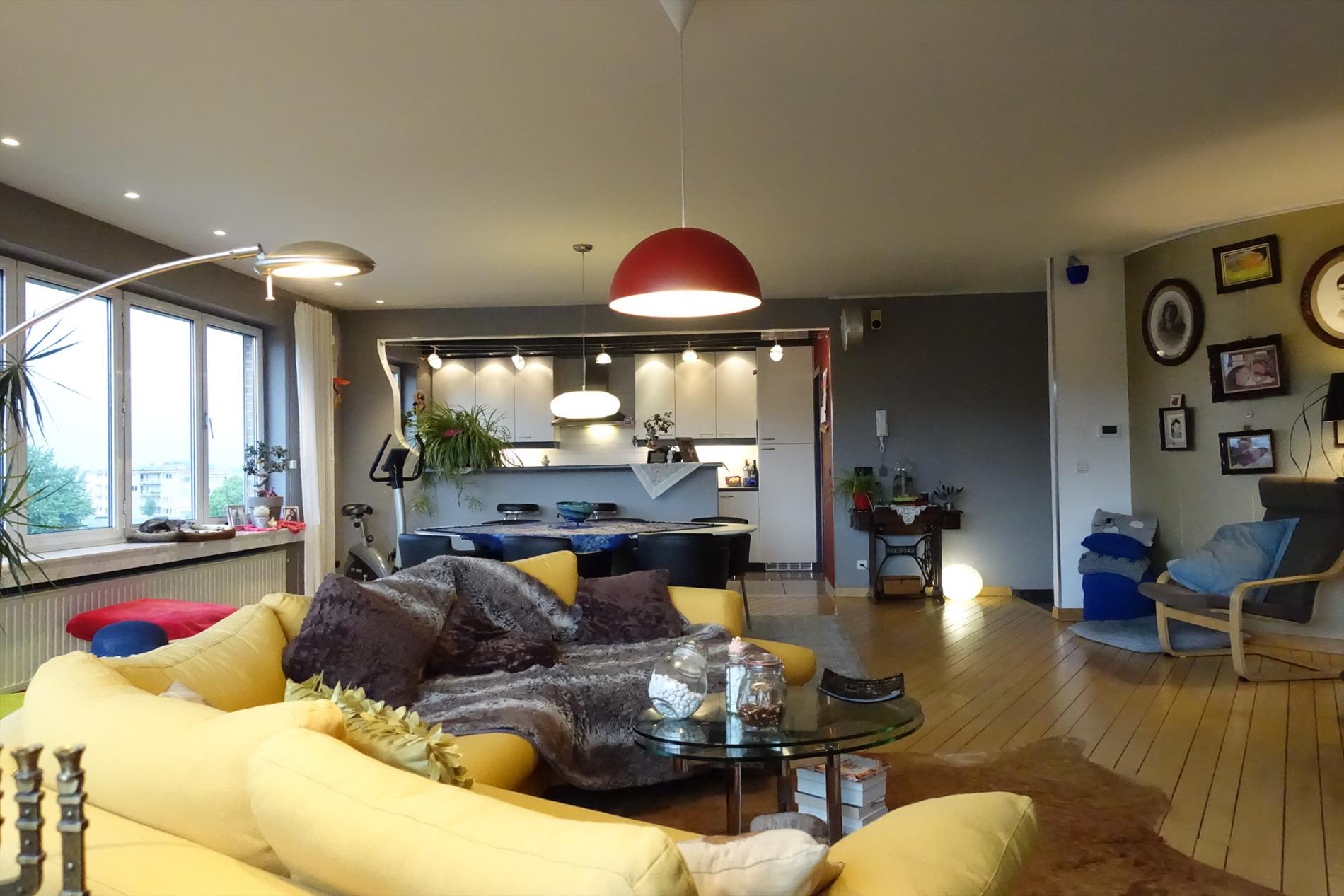 Dit dakappartement (120m²) bevindt zich op de vierde verdieping van een uitstekend onderhouden gebouw met lift en wordt gekenmerkt door zijn ruime leefruimte met veel natuurlijk lichtinval vanwege de grote raampartijen. Het appartement heeft een uniek vertezicht en situeert zich in een aangename woonomgeving zonder doorgaand verkeer. Indeling: inkomhal op blauwe hardsteentegel, een gastentoilet, een gezellige leefruimte 53m² op eikenhouten plankenvloer, een halfopen leefkeuken met aansluitend een praktische bergplaats. Verder omvat het appartement nog twee slaapkamers (13m² en 13m²) en een comfortabele badkamer. Bijzonderheden: Gunstige EPC-score, vernieuwde CV-ketel, conforme elektriciteitskeuring en het dak van het appartementsgebouw werd in maart 2018 geïsoleerd. Op de gelijkvloerse verdieping bevindt zich nog een garagebox met daarvoor één privatieve autostaanplaats.