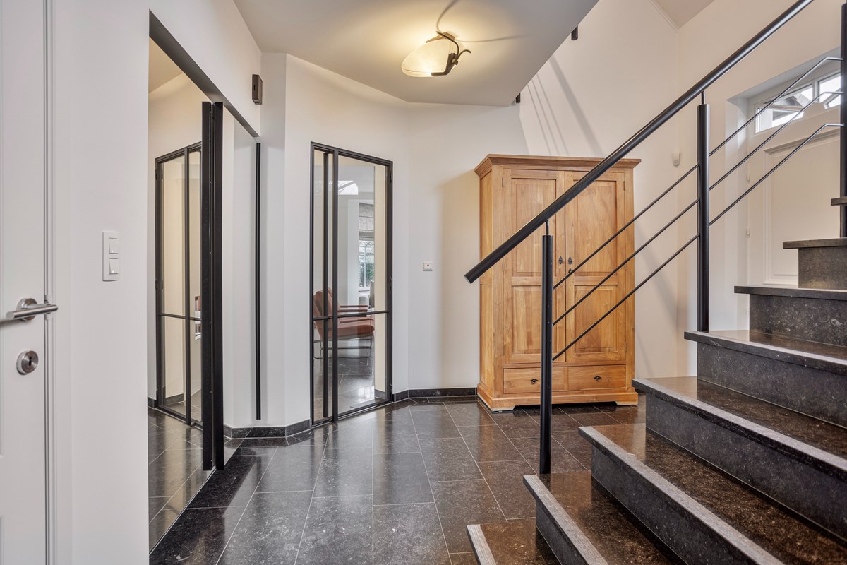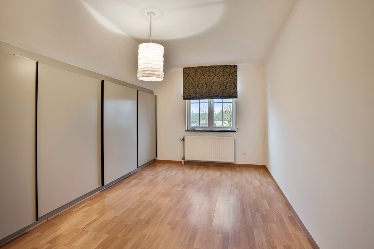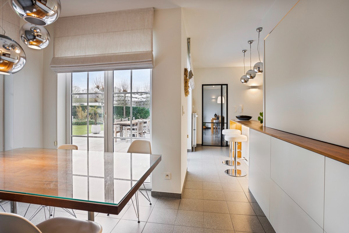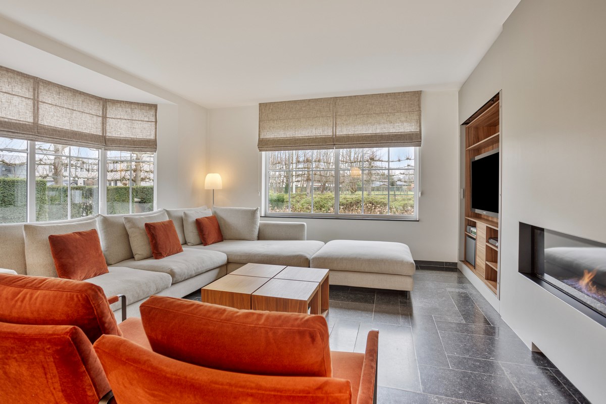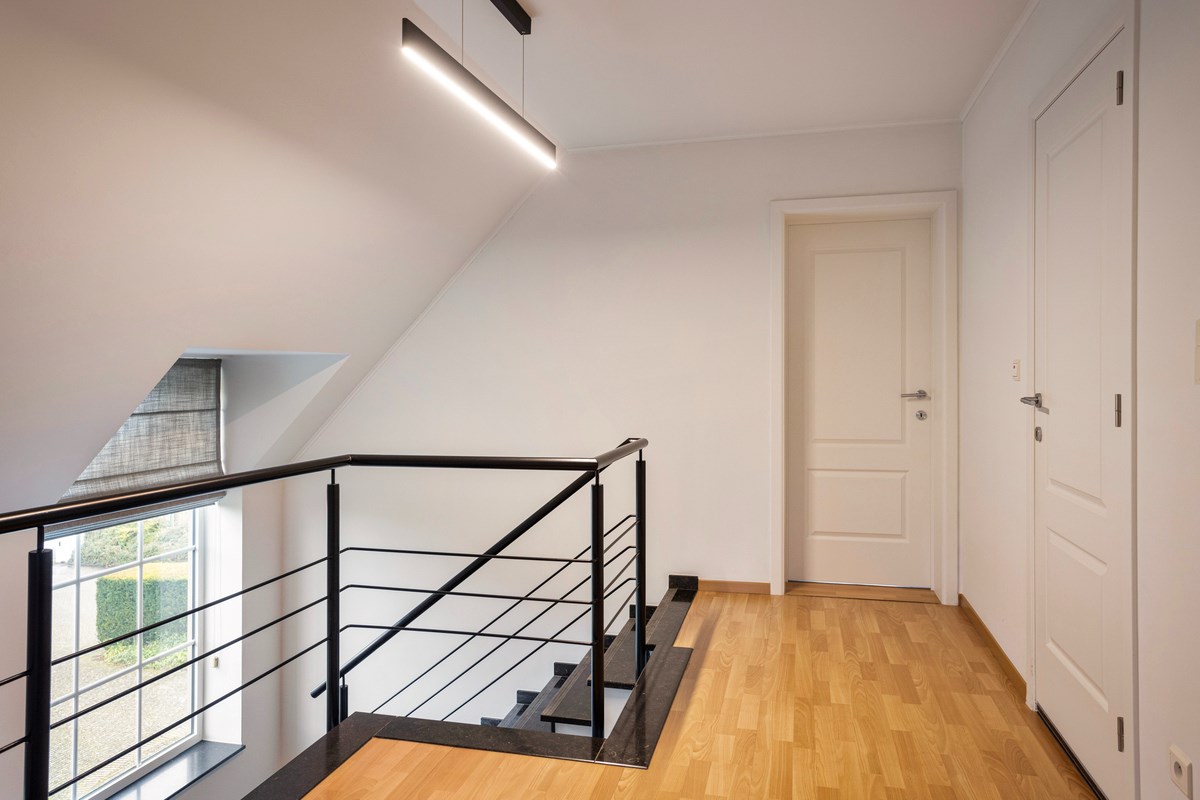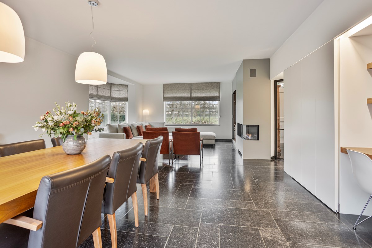 De villa biedt op het gelijkvloers een royale inkomhal met vestiaire en gastentoilet, een ruime woonruimte met inbouwhaard, een woonkeuken met eethoek, en een inpandige garage met bijkeuken. Op de verdieping bevinden zich 3 slaapkamers, een badkamer en een zolderkamer. De woning heeft bovendien een fraai aangelegde tuin met terrassen, een pergola, een vijverpartij en een poolhouse – de ideale setting voor een comfortabel gezinsleven.