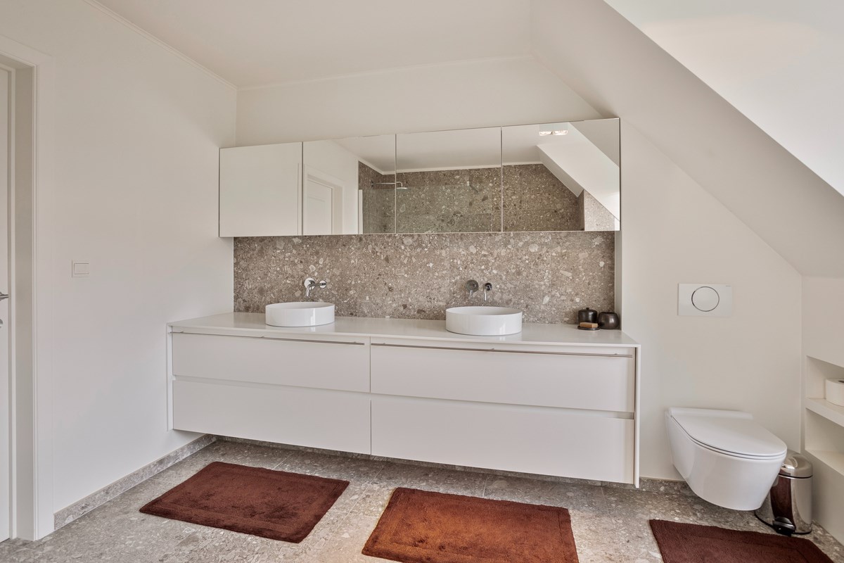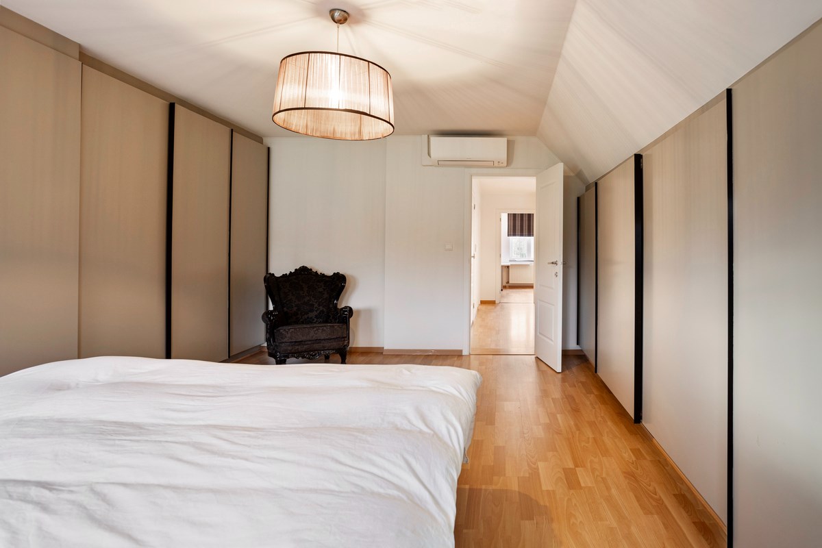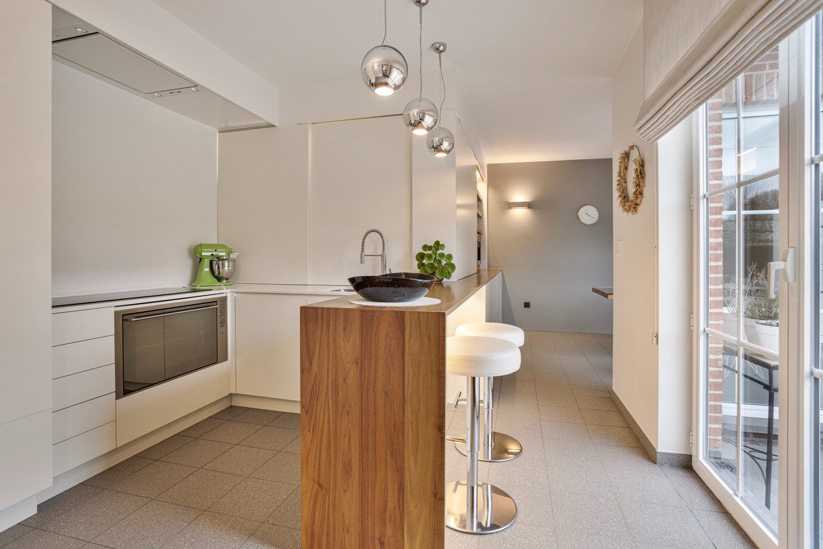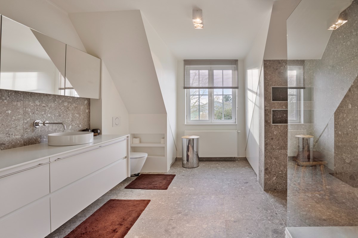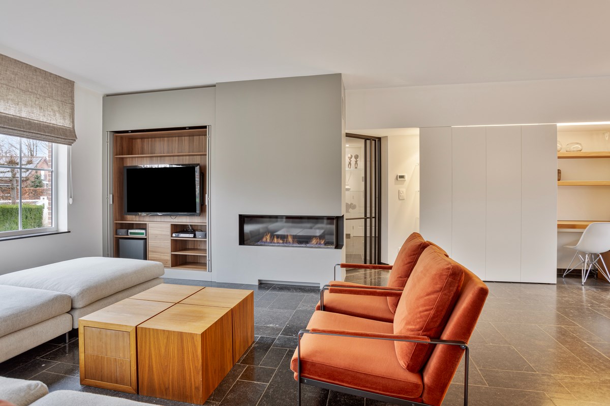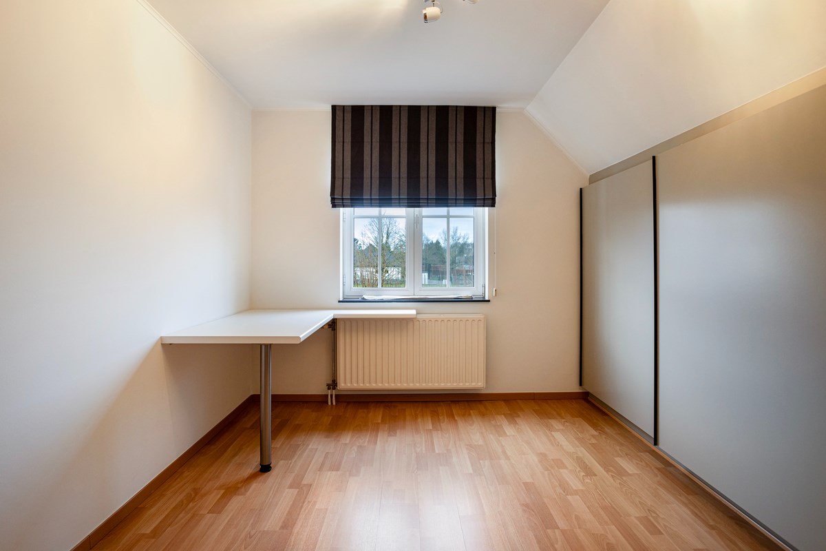 De villa biedt op het gelijkvloers een royale inkomhal met vestiaire en gastentoilet, een ruime woonruimte met inbouwhaard, een woonkeuken met eethoek, en een inpandige garage met bijkeuken. Op de verdieping bevinden zich 3 slaapkamers, een badkamer en een zolderkamer. De woning heeft bovendien een fraai aangelegde tuin met terrassen, een pergola, een vijverpartij en een poolhouse – de ideale setting voor een comfortabel gezinsleven.